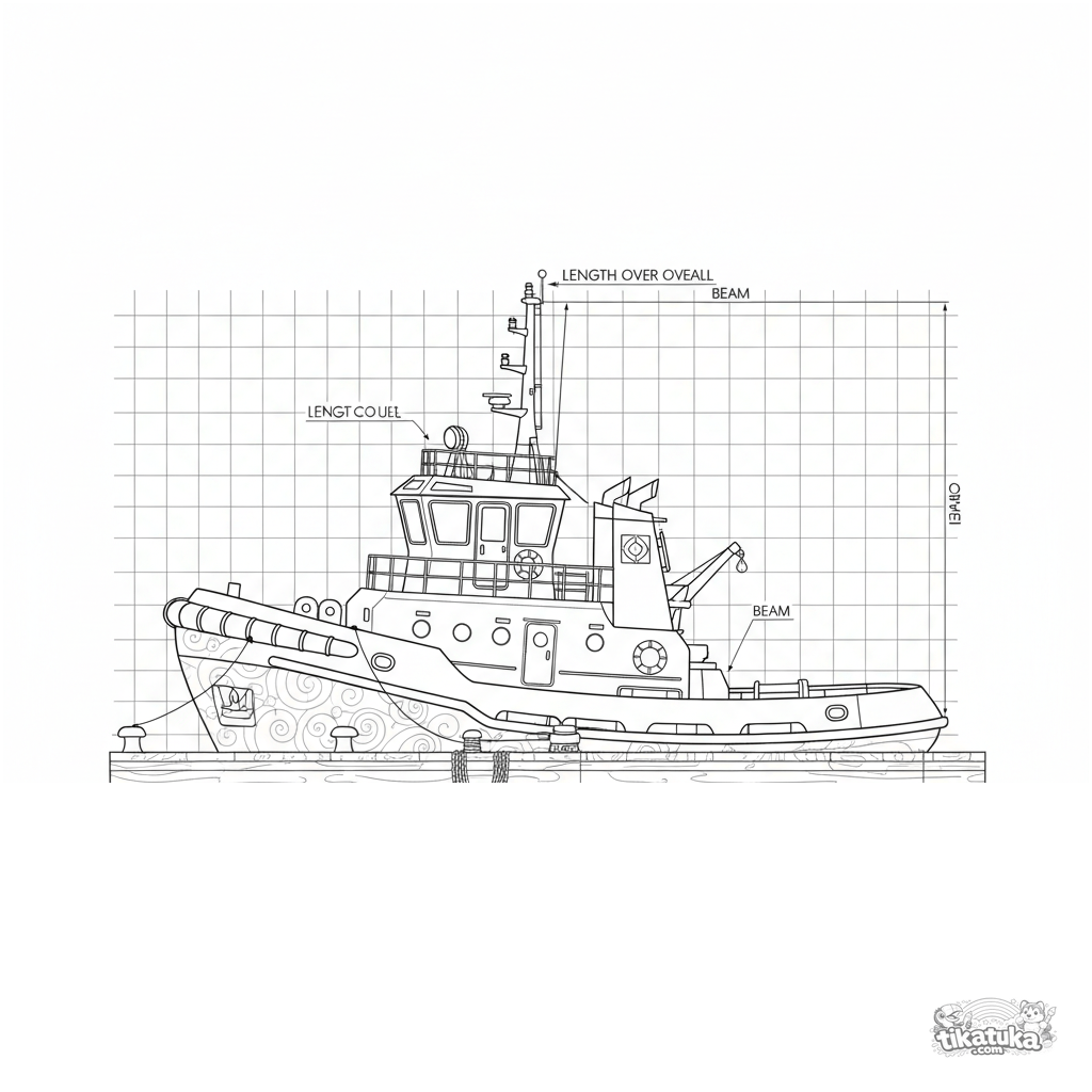 Página para colorear estilo plano técnico para niños mayores 10-12: un diagrama en vista lateral de un remolcador de puerto atracado en un muelle, con líneas de cuadrícula y detalles de medición.