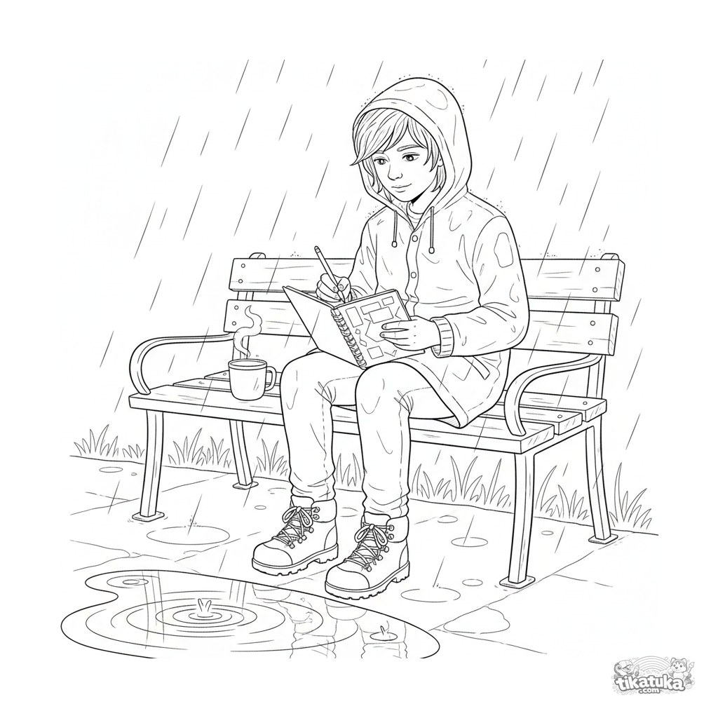 Página para colorear detallada para niños 10-12: un adolescente con impermeable dibuja en un cuaderno en un banco de parque otoñal bajo la lluvia.
