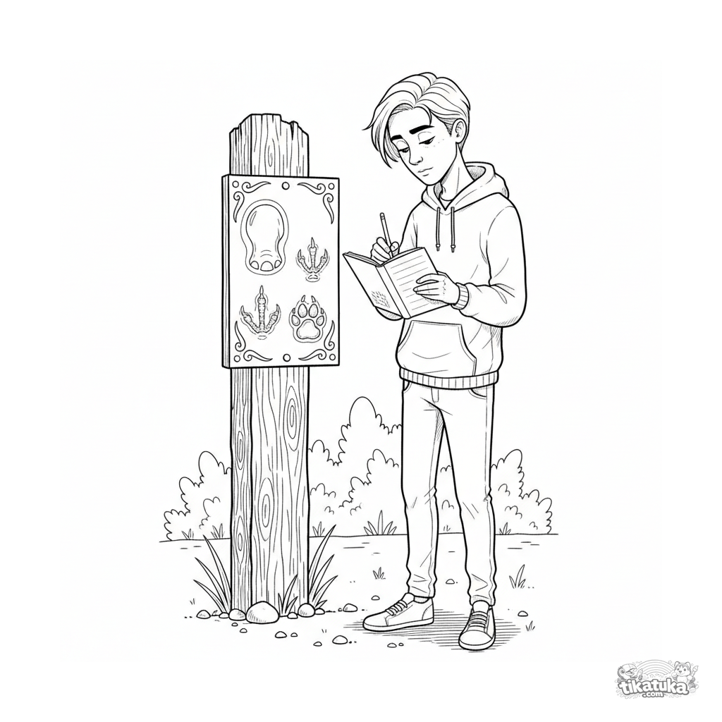 Página para colorear para 10-12 años: un adolescente compara huellas de animales en una placa de descubrimiento del zoológico. Escena educativa detallada sobre observación y ciencia.