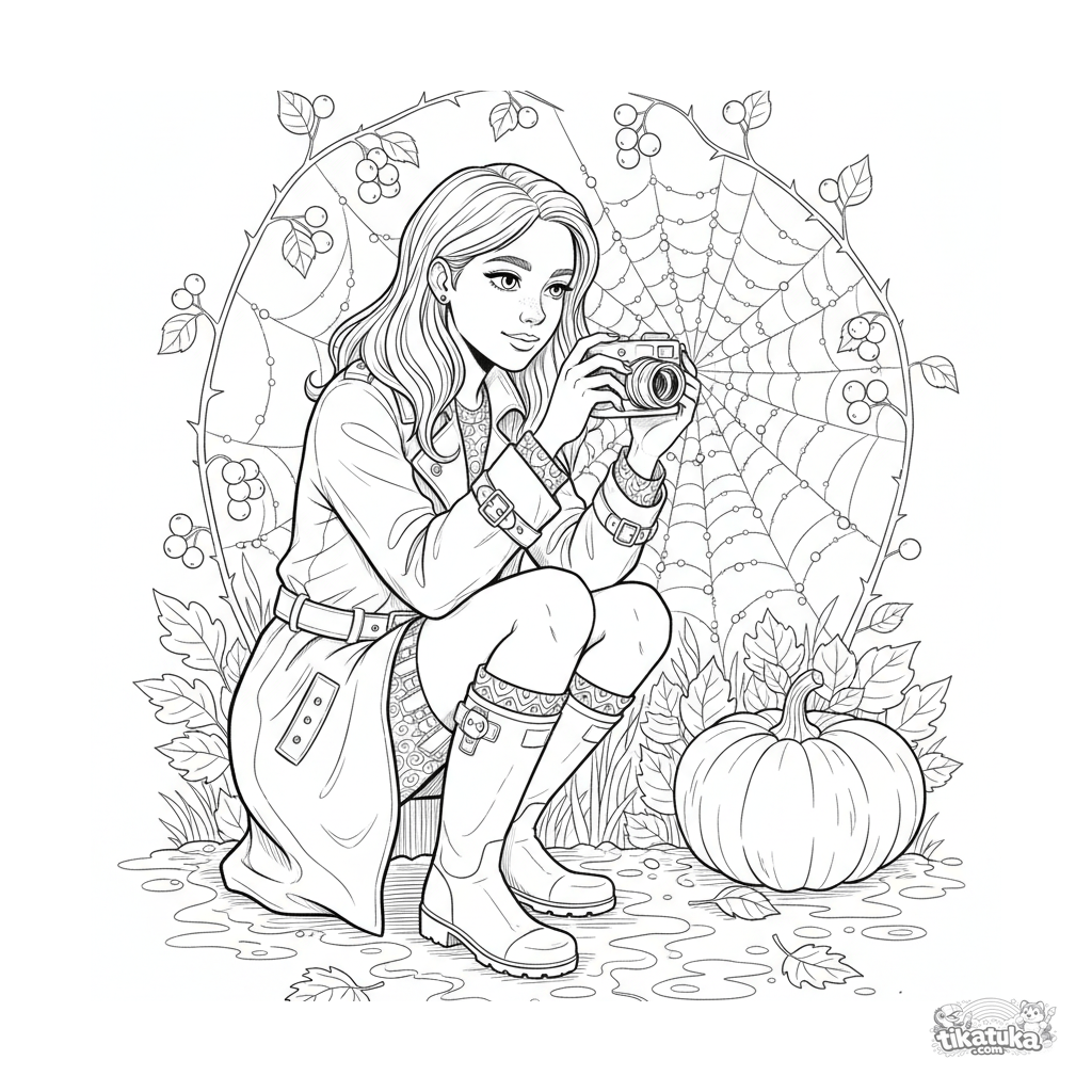 Página para colorear para niños mayores 10-12: un adolescente con botas de goma fotografía gotas de lluvia en una telaraña en un jardín de otoño.