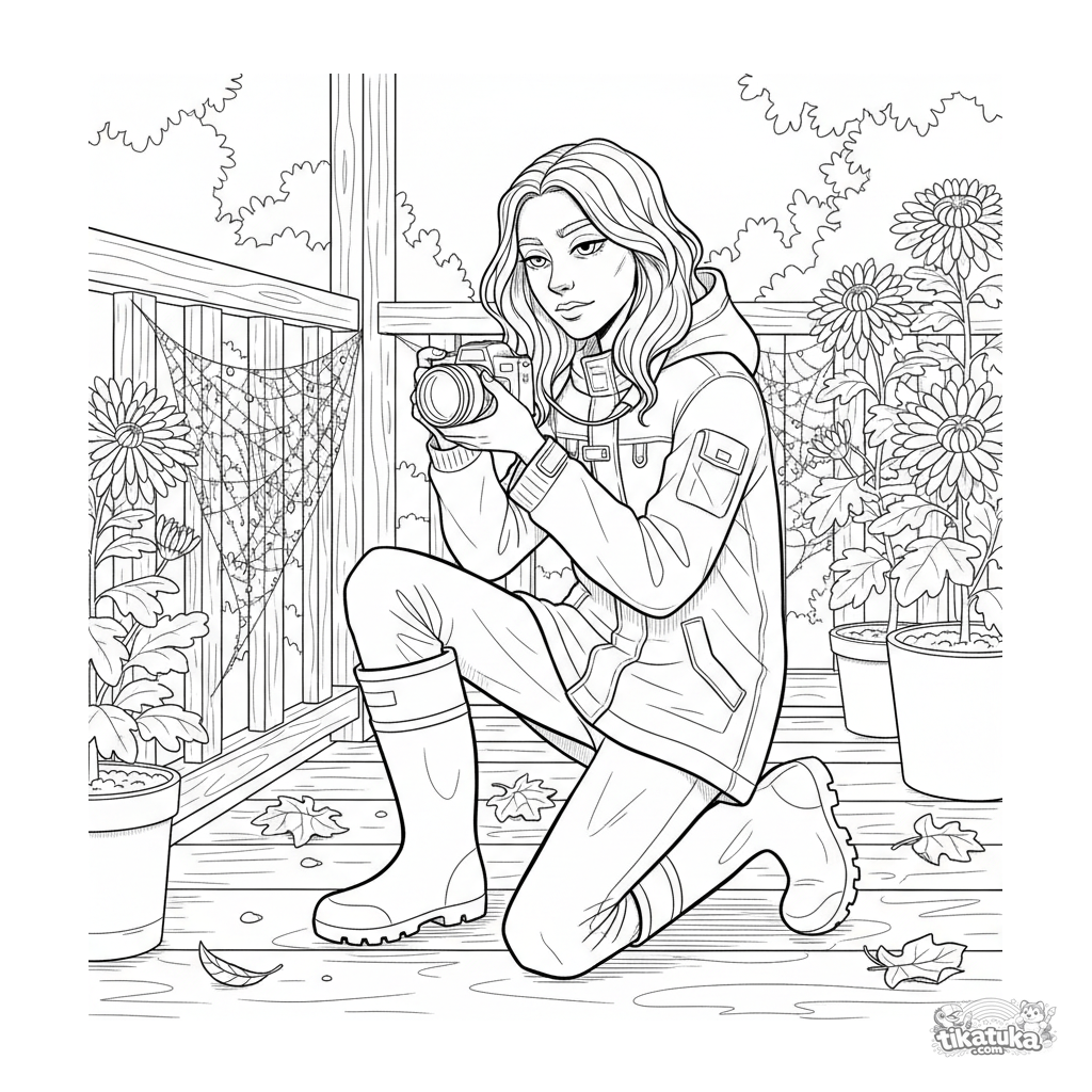 Página para colorear detallada para niños de 10-12 años: un adolescente en un porche fotografía gotas de lluvia en telarañas de otoño. Escena compleja con texturas y perspectiva.
