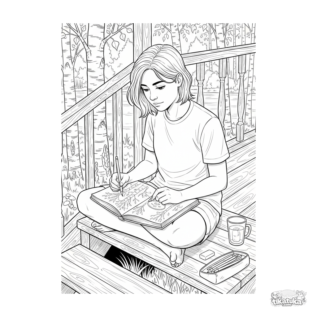 Página detallada para colorear para niños de 10-12 años: un adolescente dibujando el paisaje desde el porche de una casa de campo. Escena con cuaderno, lápices y té.