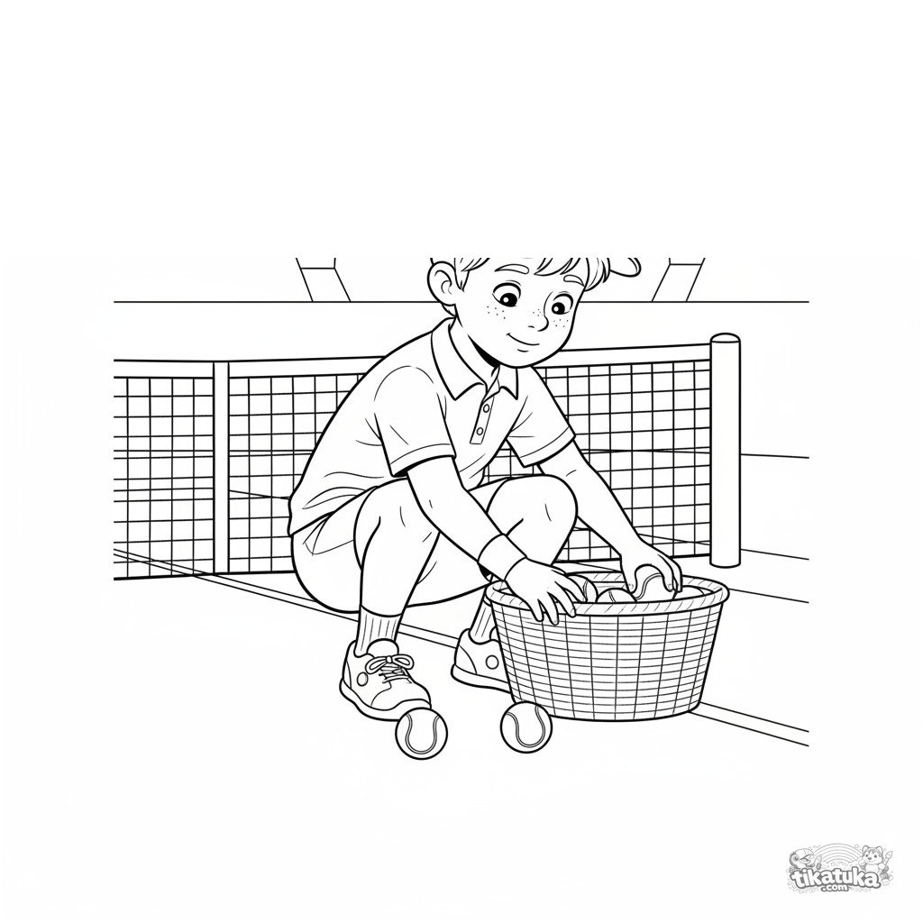 Página para colorear para niños de 7-9 años: un recogepelotas en una pista de tenis reuniendo pelotas en una cesta cerca de la red. Escena tras bambalinas.