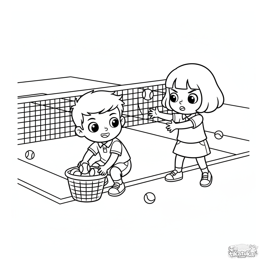 Página para colorear para niños de 7-9 años: ayudantes en una cancha de tenis atrapan y recogen pelotas.