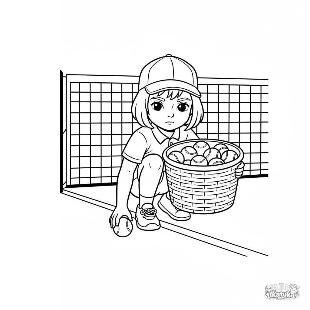 Página para colorear para niños de 7-9 años: un recogepelotas en una pista de tenis con una cesta de pelotas. Escena muestra un rol importante pero menos visible.