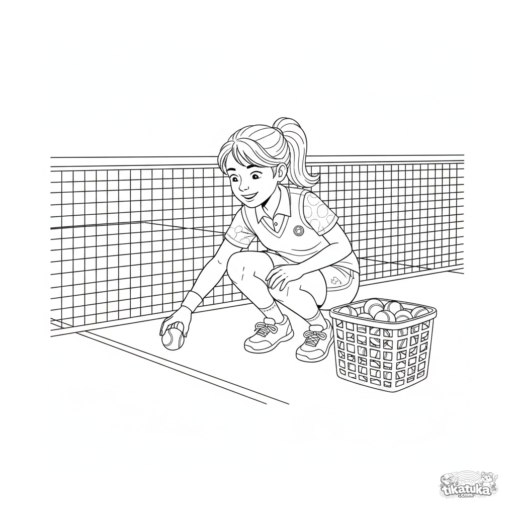 Página para colorear para 10-12 años: un recogepelotas con uniforme se agacha junto a la red en una cancha de tenis. Escena detallada con cesta y uniforme.
