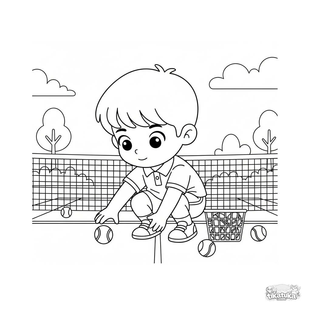 Página para colorear para niños de 4-6 años: un recogepelotas de tenis en la pista. El niño recoge una pelota cerca de la red.