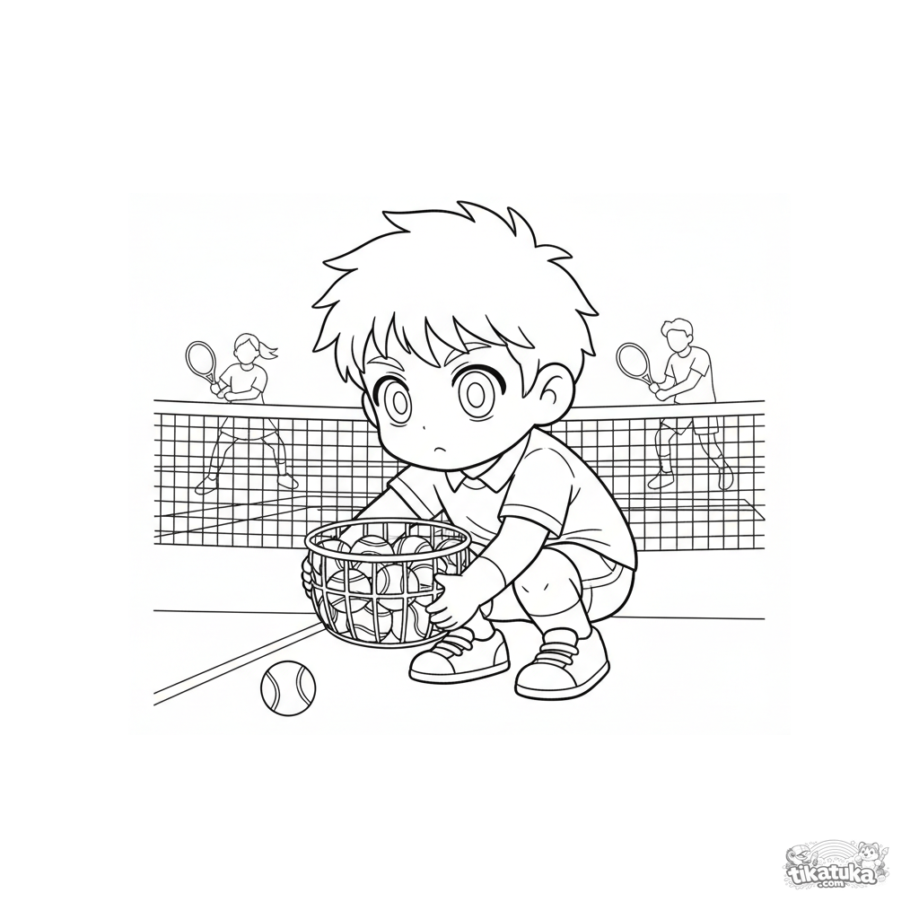 Página para colorear para niños de 7-9 años: un recogepelotas atento al borde de la cancha se prepara. Pose dinámica de espera.