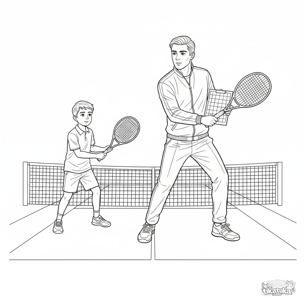 Página detallada para colorear para niños de 10-12 años: un entrenador de tenis demuestra la técnica del revés a un alumno en la cancha.
