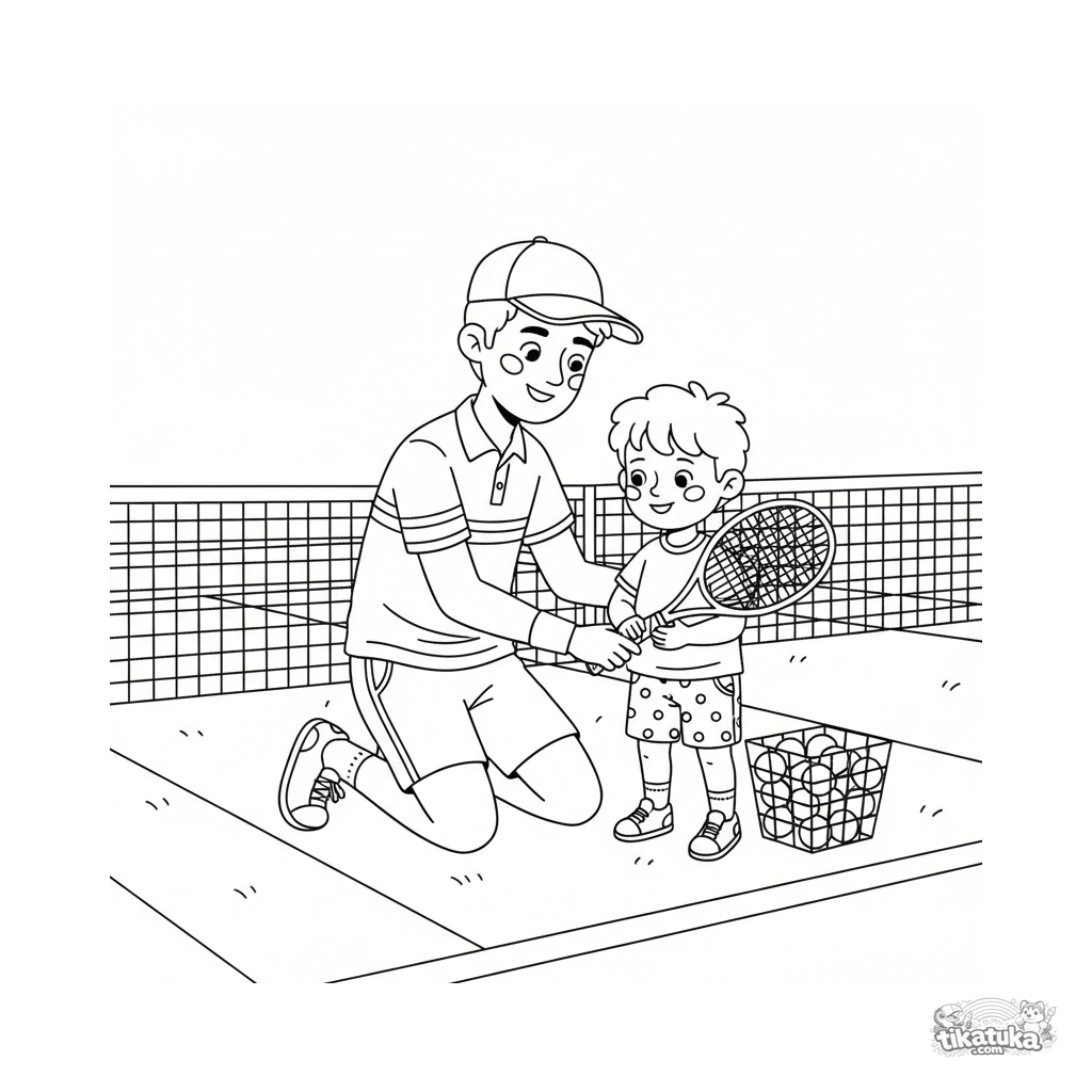 Página para colorear detallada para 10-12 años: un entrenador enseñando a un niño lo básico del tenis en una pista. Escena de mentoría, cesta de pelotas.