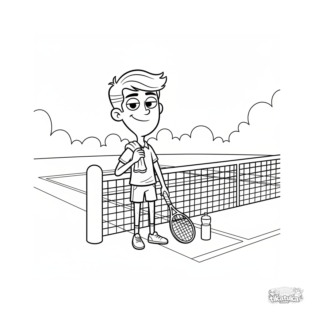 Página para colorear para niños 7-9: un tenista cansado descansa apoyado en el poste de la red, secándose el sudor. Escena de descanso tras entrenar.