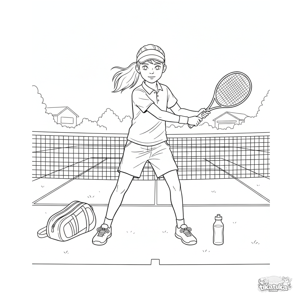 Página para colorear para 7-9 años: un tenista practicando la técnica del revés en una pista. Líneas claras, enfoque en la forma.