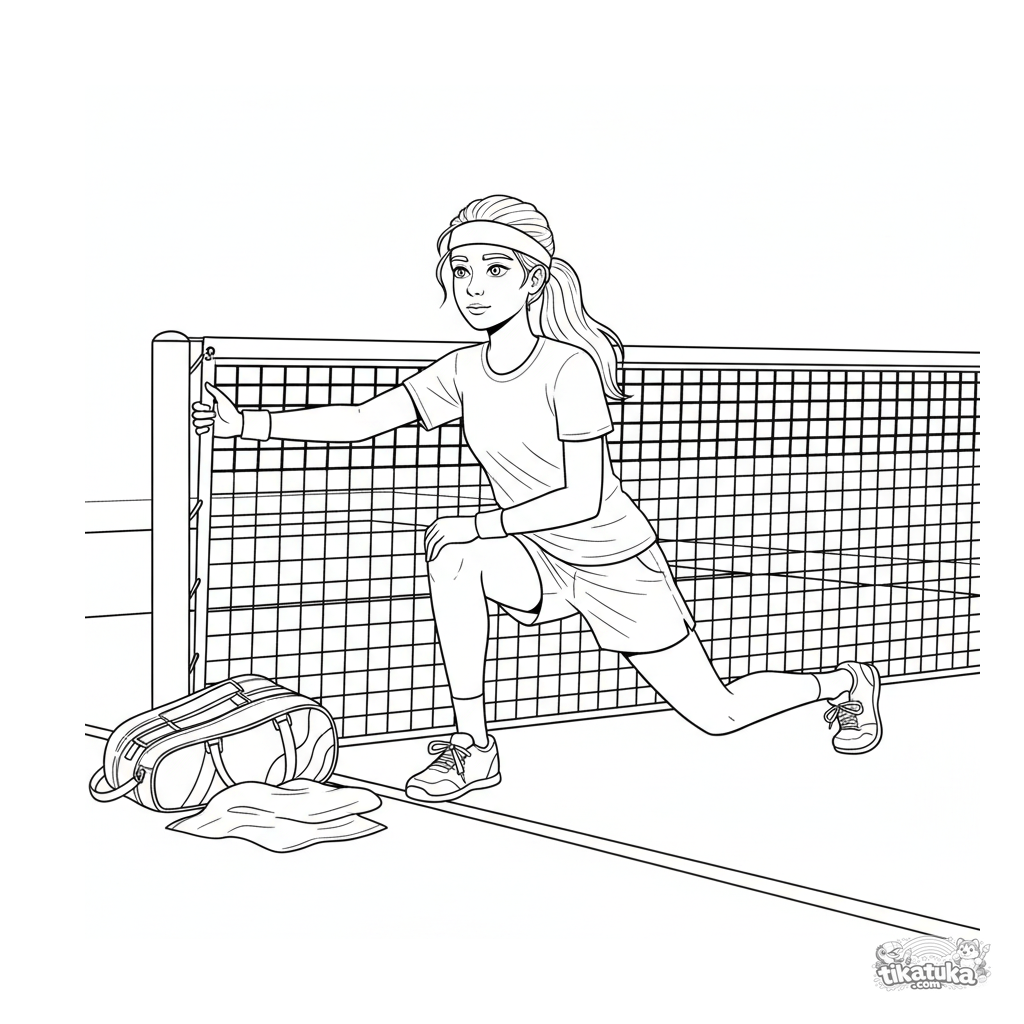 Página detallada para colorear para niños 10-12: un tenista estirándose en la red antes del partido. Proporciones realistas, bolso y detalles.