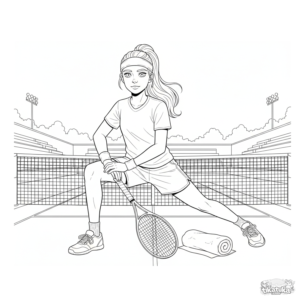 Página detallada para colorear para niños 10-12 años: un tenista adolescente estirándose en la pista antes de un partido. Detalles de ropa, raqueta, toalla y líneas.