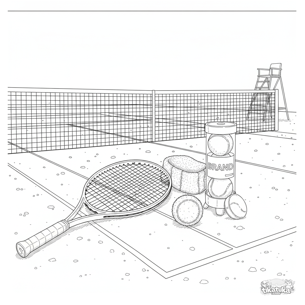 Página para colorear intrincada para 10-12: un bodegón detallado de una raqueta y pelota de tenis. Estilo técnico, líneas limpias, texturas.