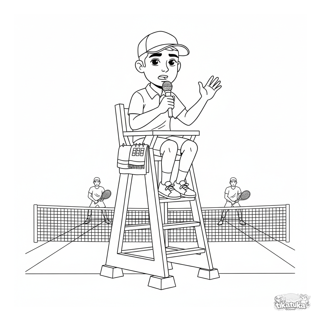 Página para colorear detallada para niños mayores de 10-12 años: un árbitro de tenis anuncia el marcador. Escena con elementos de fondo.