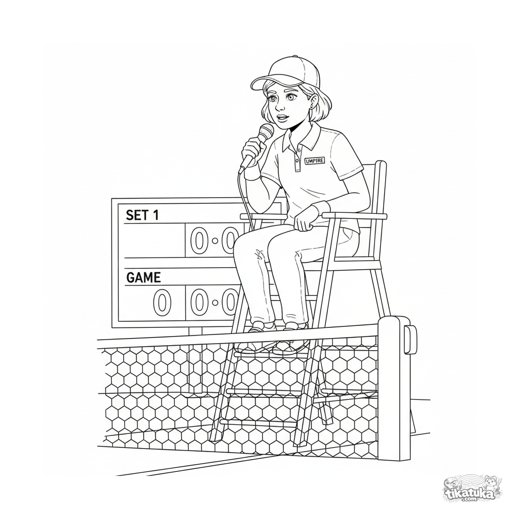 Página para colorear para niños de 4-6 años: un árbitro en una pista de tenis sentado en una silla alta hablando por micrófono. Escena educativa.