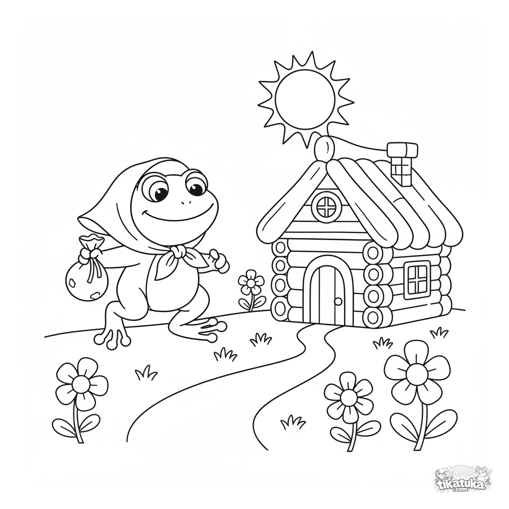 Página simple para colorear para niños pequeños del cuento Teremok: la rana salta hacia la casita. Formas grandes, pocos detalles. Para niños de 2 a 3 años.