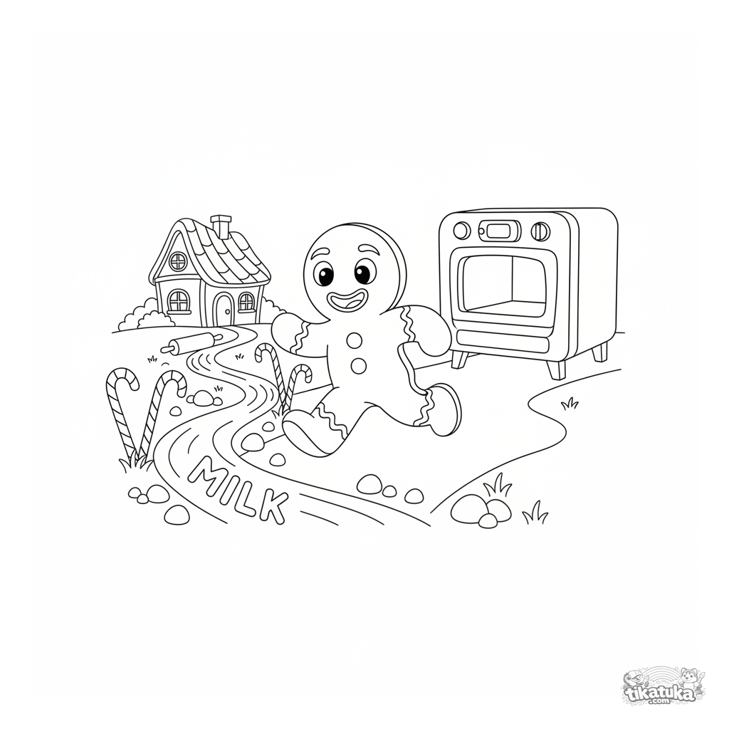 Página para colorear de cuento: El Hombre de Jengibre corre junto a un río de leche en un paisaje de dulces. Escena vibrante del cuento clásico para 4-6 años.
