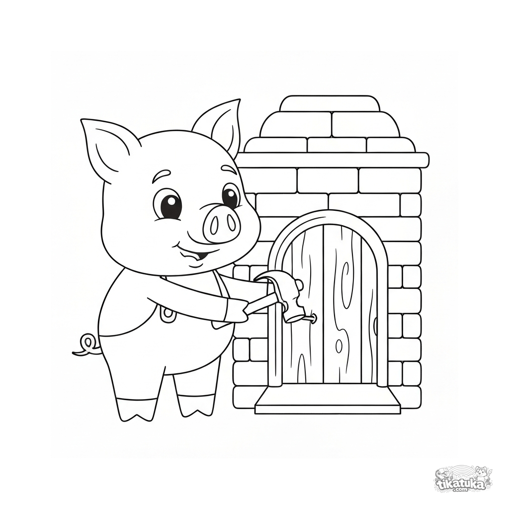 Página para colorear para niños. El tercer cerdito junto a su casa de ladrillos, martillando un clavo grande en la puerta de madera. Descarga gratis.