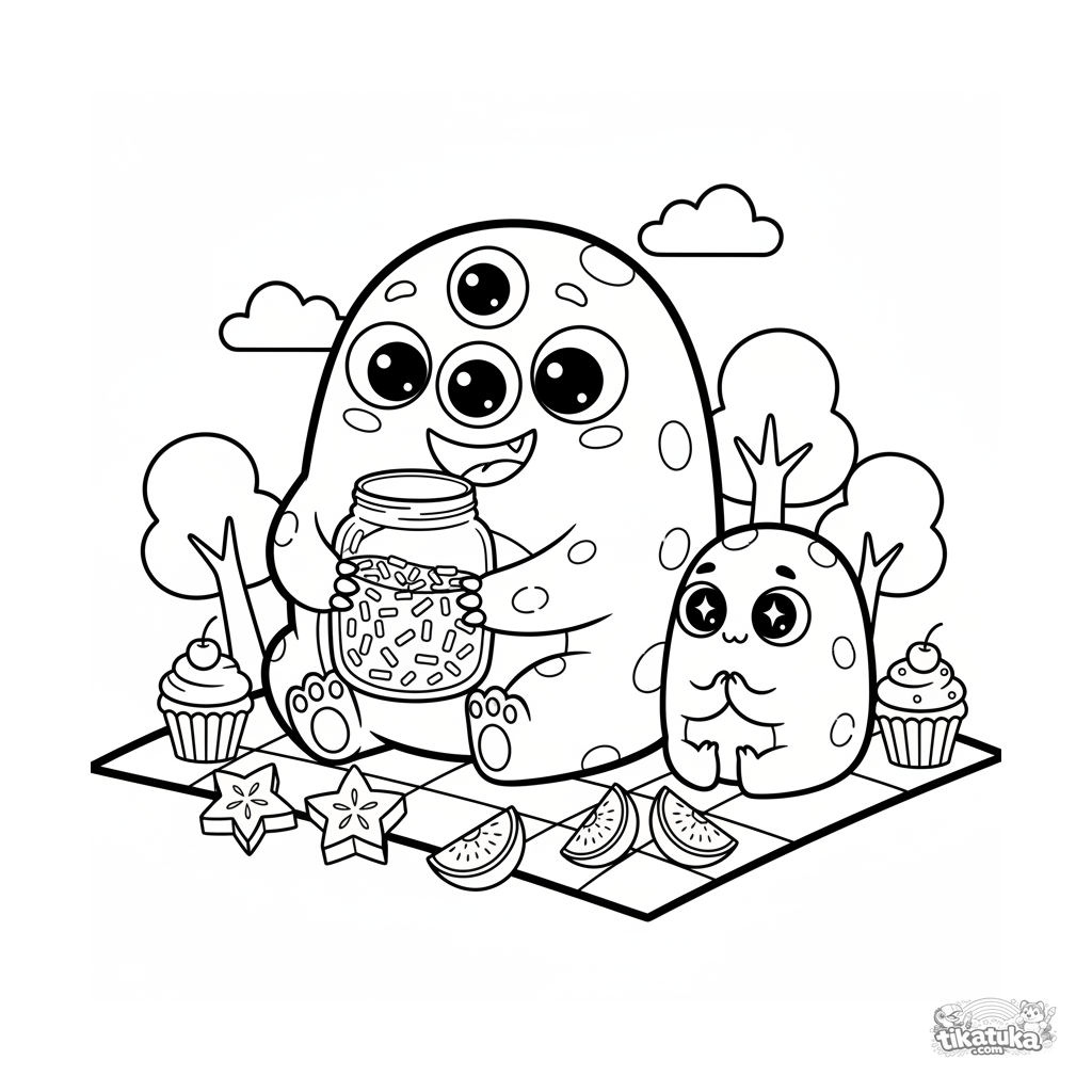 Página para colorear de un monstruo de tres ojos compartiendo un frasco de sprinkles en un picnic. Escena de amistad para niños de 4-6 años.