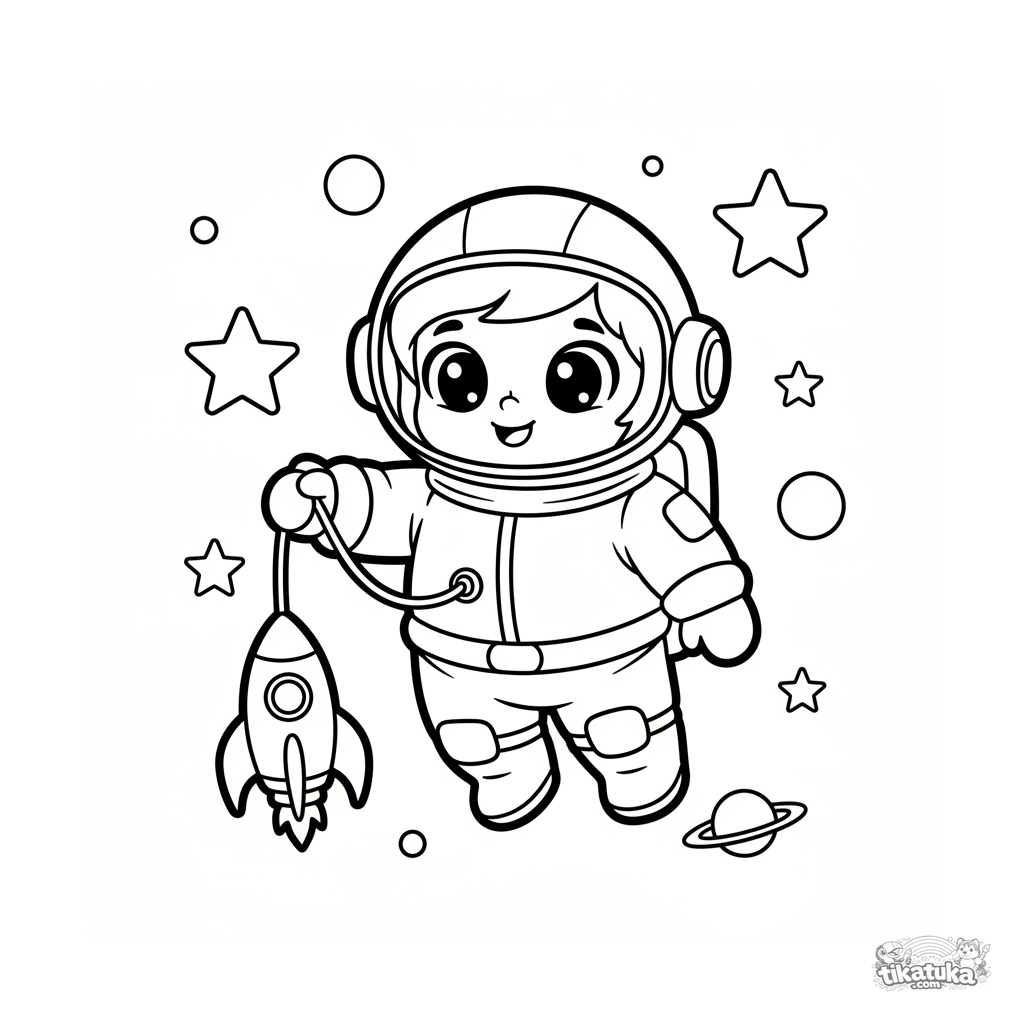 Página para colorear para bebés: un pequeño astronauta flota entre estrellas en el espacio exterior, sosteniendo un cohete de juguete. Formas simples y amplios márgenes.