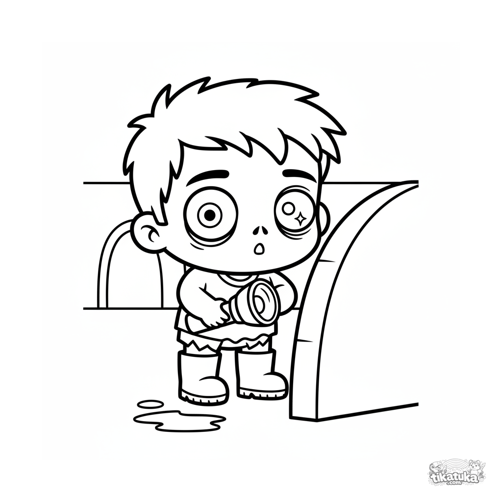 Página para colorear para bebés 2-3: un zombi pequeño y lindo en botas grandes explora un túnel de alcantarilla con una linterna. Formas simples y grandes.