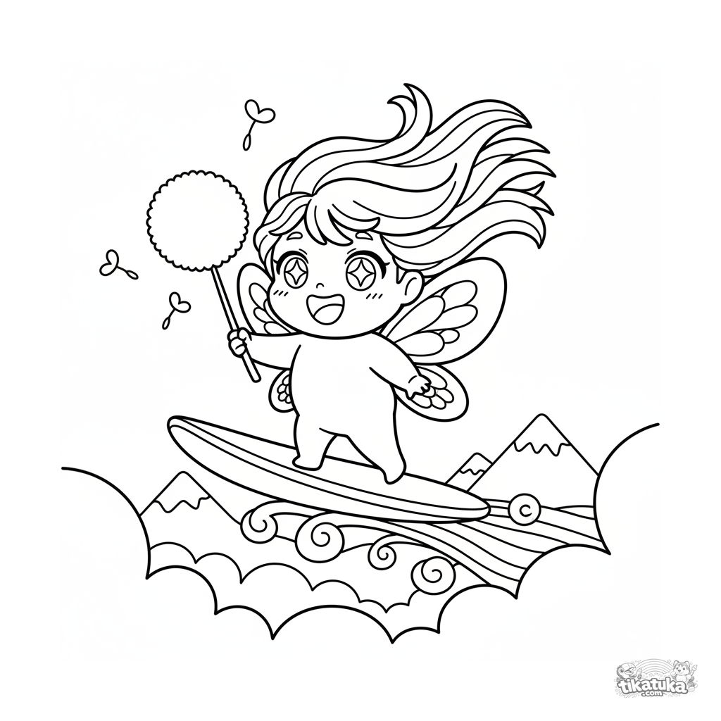 Página para colorear para niños pequeños 2-3: un pequeño duendecillo de nubes cabalga una ráfaga de viento entre nubes esponjosas. Formas grandes y simples.