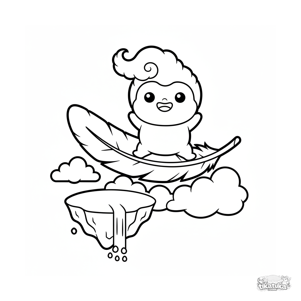 Página simple para colorear para bebés 2-3: un duendecillo de nubes monta una pluma por el cielo. Formas grandes y simples, márgenes amplios para colorear.