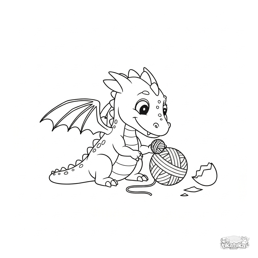 Página para colorear para niños pequeños: un lindo bebé dragón juega con un ovillo de lana. Dibujo realista simple con contornos claros.