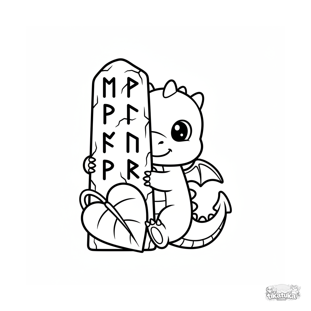 Página para colorear para niños pequeños 2-3: un tímido bebé dragón juega al escondite detrás de un antiguo pilar rúnico. Formas muy simples, detalles grandes, contornos gruesos.