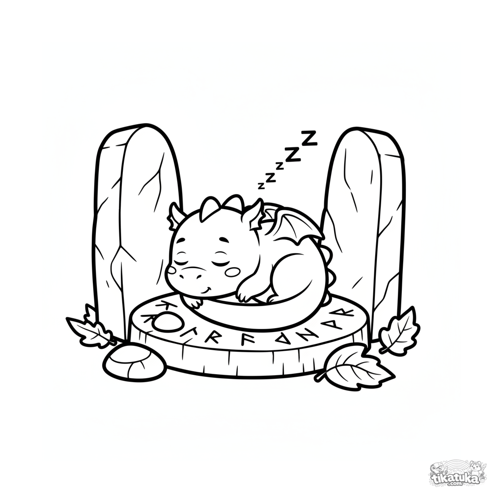 Página para colorear para niños pequeños de 2-3 años: un pequeño dragón duerme profundamente, acurrucado en una piedra rúnica. Formas simples y grandes.