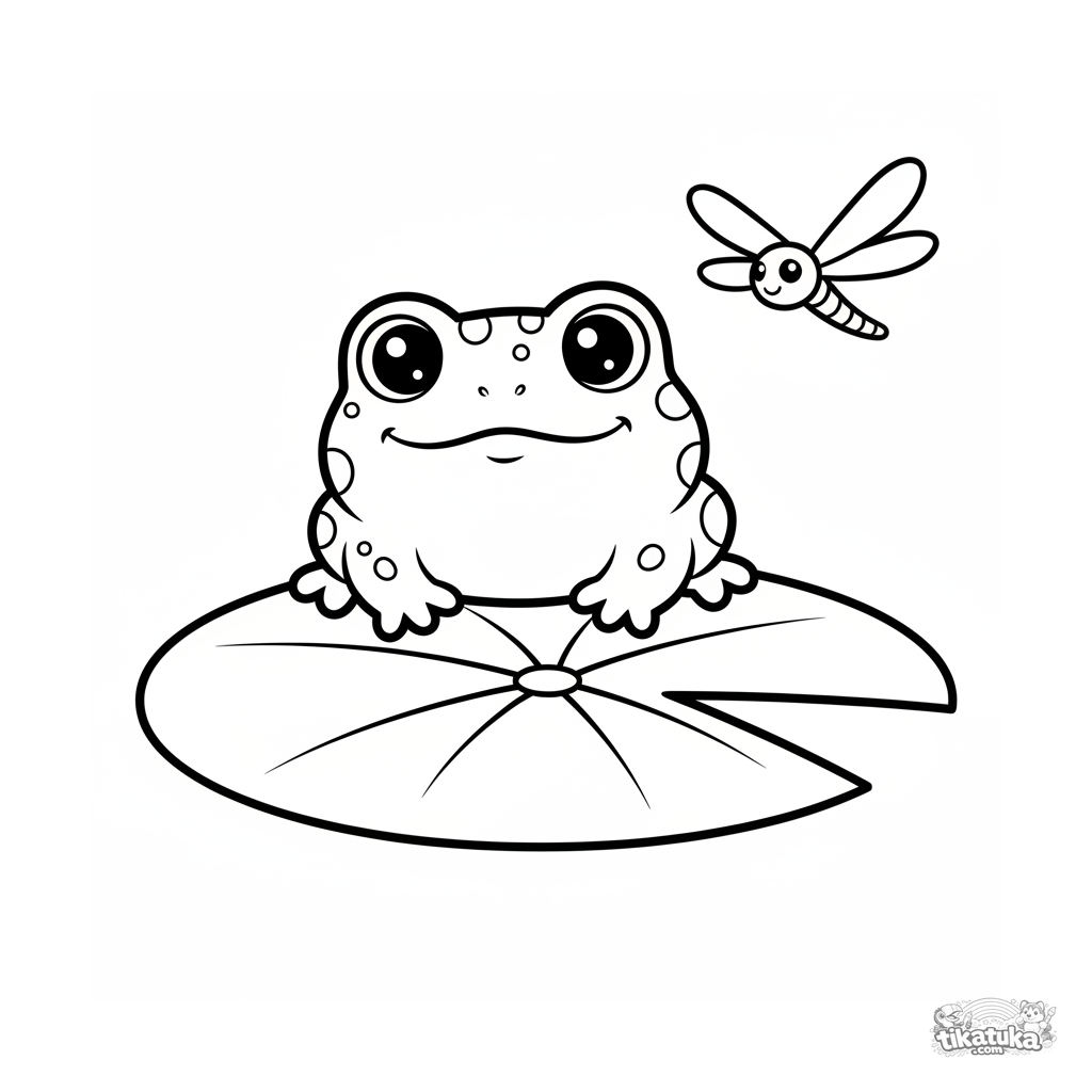 Página para colorear simple para niños pequeños 2-3: una linda ranita se sienta en un nenúfar junto a un arroyo, mirando su reflejo en el agua.