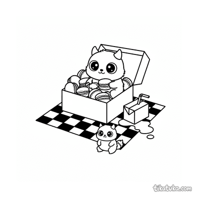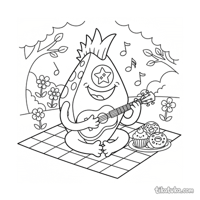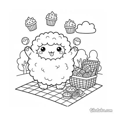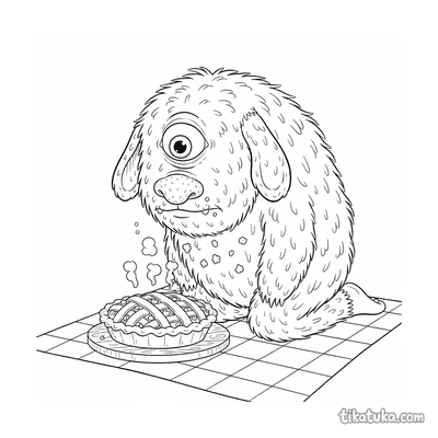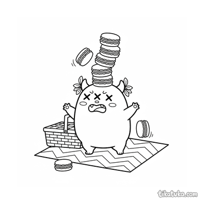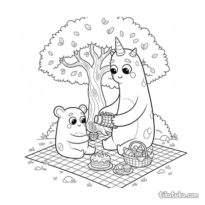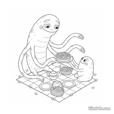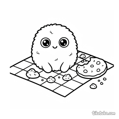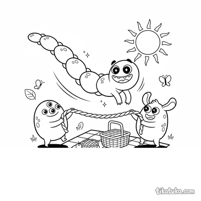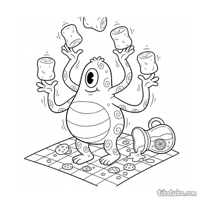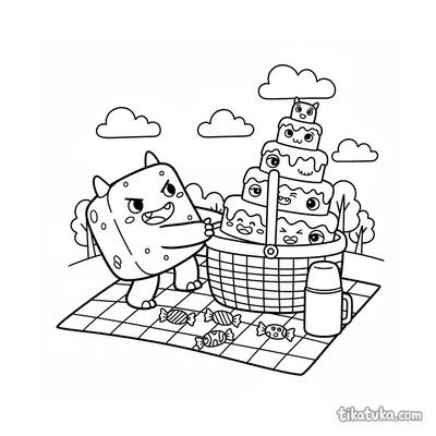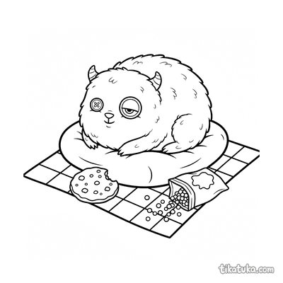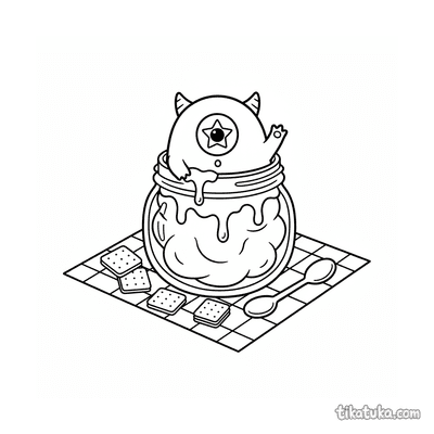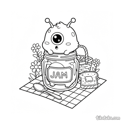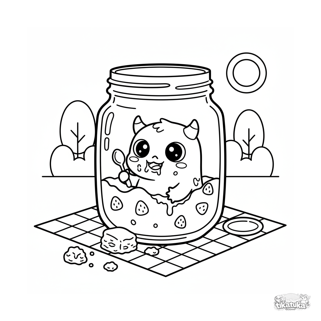 Página para colorear para niños 4-6: un monstruo pequeño con cuernos escondido en un tarro de mermelada en un picnic. Escena divertida.