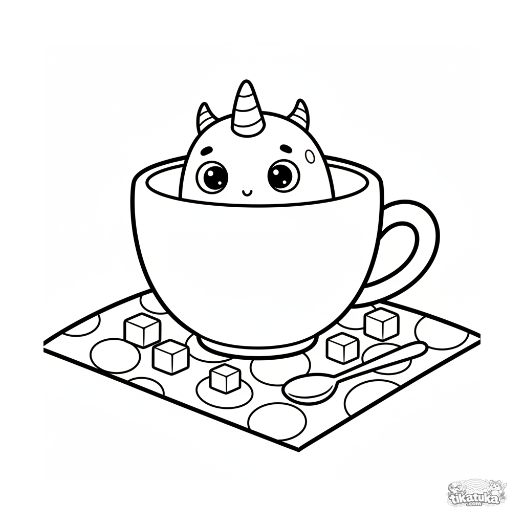 Página muy simple para colorear para bebés de 2 a 3 años: un monstruito con cuernos asomándose de una taza grande en un picnic. Formas grandes y claras.