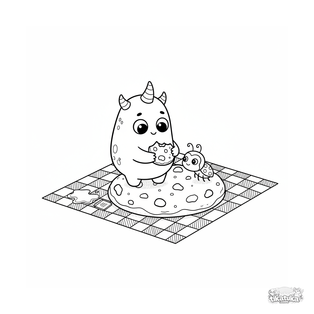 Página para colorear para niños de 7-9 años: un monstruo pequeño con cuernos compartiendo una galleta con una mariquita en un picnic.