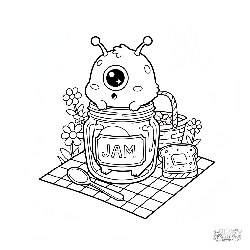 Página para colorear para niños de 4-6 años: un monstruito pequeño asomándose de un tarro de mermelada en un picnic.