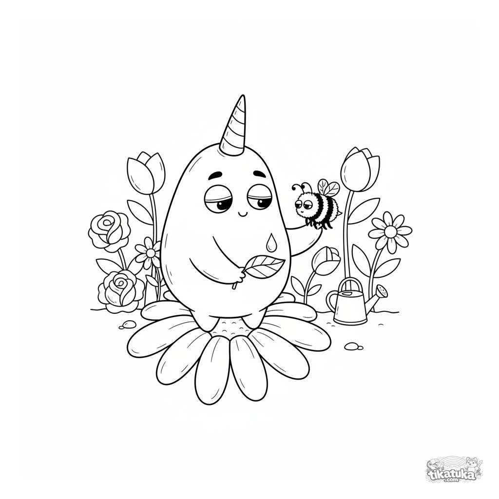 Página para colorear para niños 4-6: un monstruito minúsculo con un cuerno ayuda a un abejorro en un jardín de flores. Dulce escena sobre amistad y ayuda.