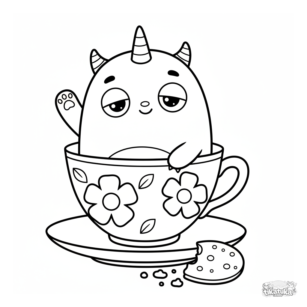 Página para colorear simple para niños pequeños: un monstruo miniatura con un cuerno saluda desde una taza de té, rodeado de migas de galleta. Formas grandes.