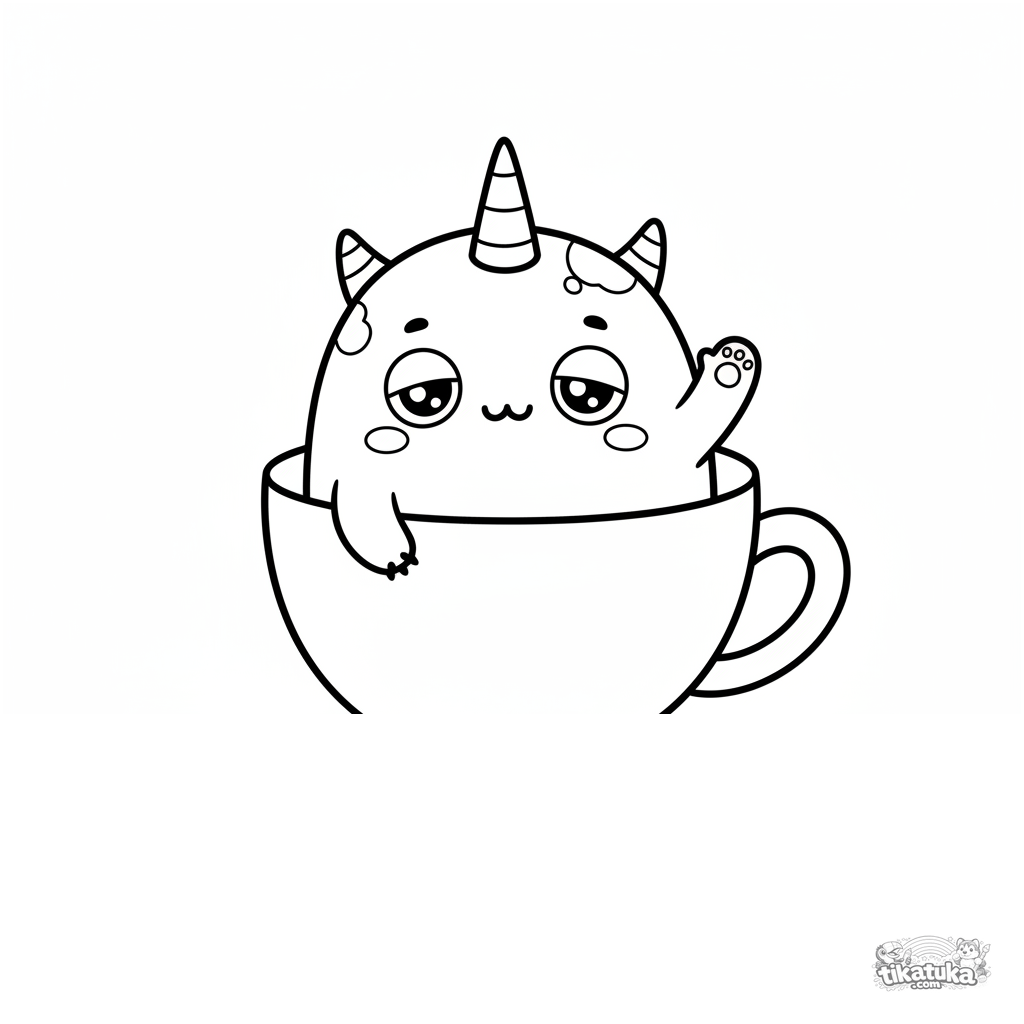 Página para colorear simple para bebés de 2-3 años: un monstruo diminuto con un cuerno saludando desde una taza de té.