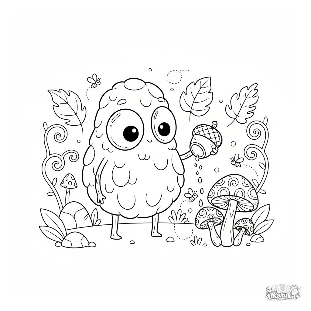 Página para colorear de un golem de musgo en un bosque encantado. Para niños de 4 a 6 años. Criatura amigable regando hongos brillantes.