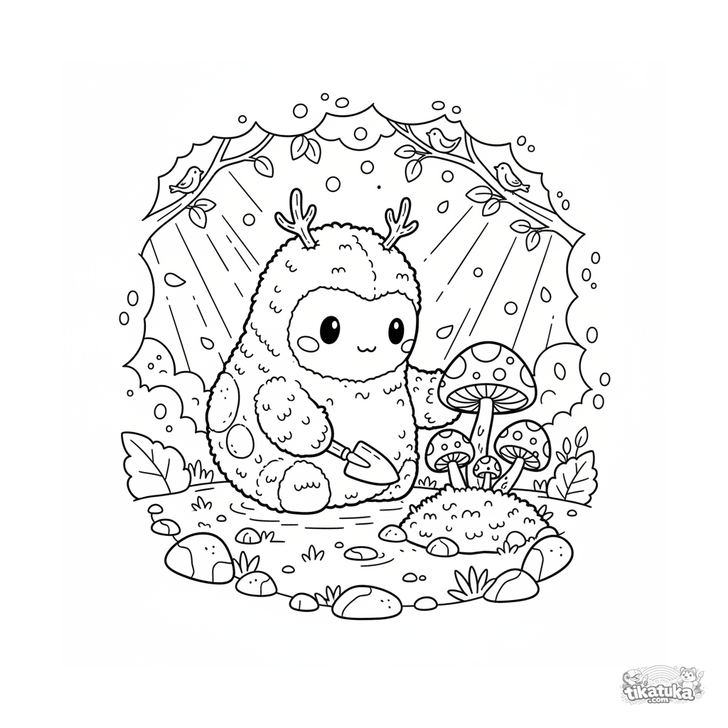 Página para colorear para niños 4-6: un golem de musgo cuida hongos brillantes en un bosque encantado. Escena de fantasía adorable.