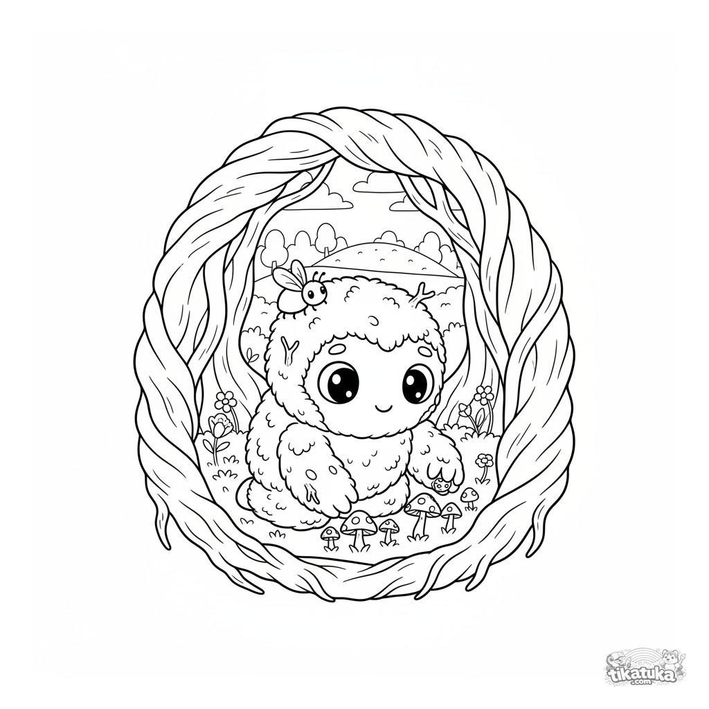 Página para colorear de un golem de musgo cuidando hongos brillantes en una cueva de raíces antiguas. Para niños de 4-6 años.