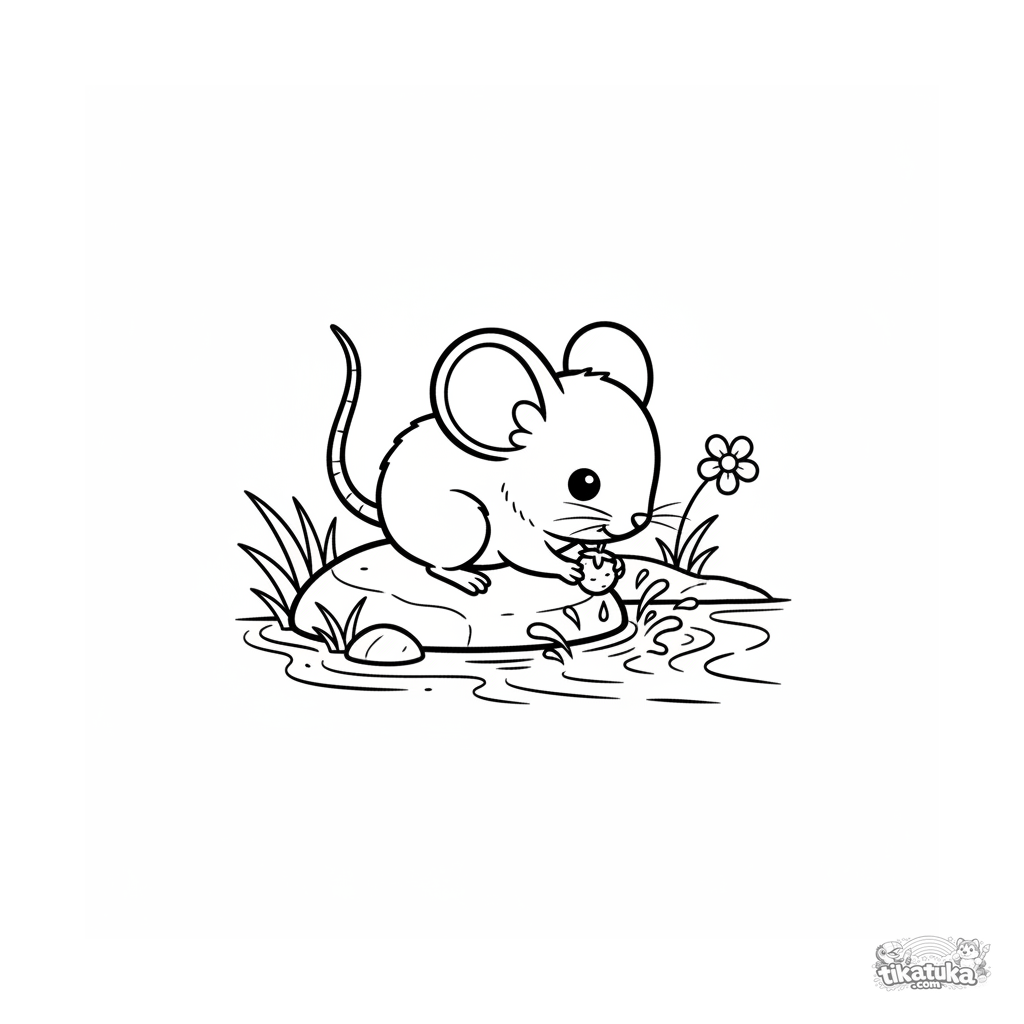 Página para colorear estilo chibi para niños 4-6: un ratoncito de campo bebe de un arroyo mientras está sentado en una piedra, sosteniendo una baya silvestre en sus patitas.