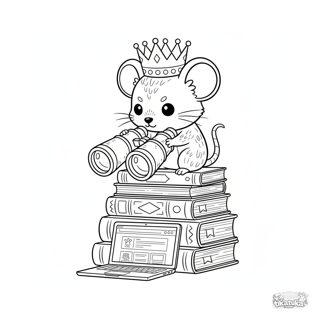 Página para colorear para niños 10-12: un ratón diminuto con corona de papel en un fuerte de libros con binoculares gigantes, mirando una laptop. Escena divertida en estilo chibi.