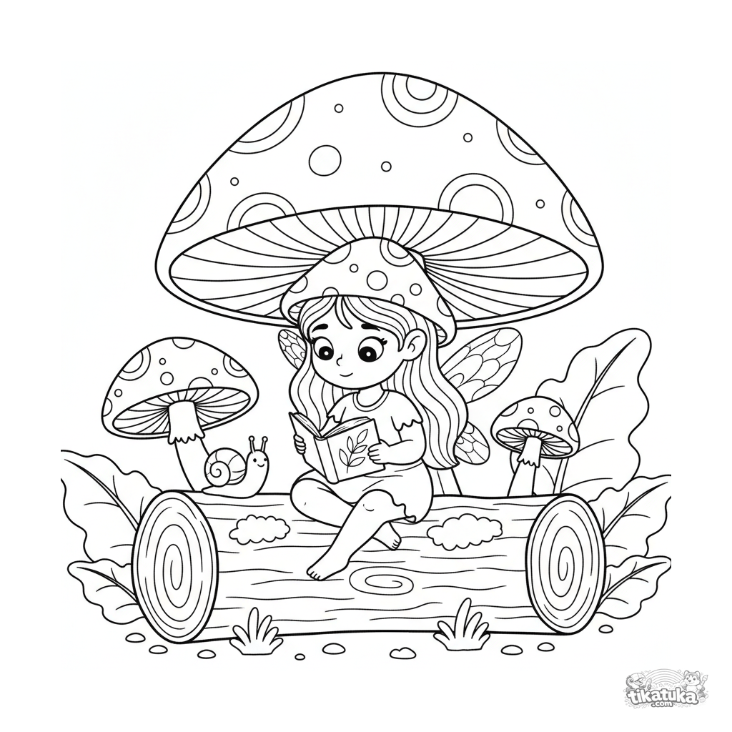Página para colorear para niños 4-6: un hada de champiñón lee un libro bajo un hongo brillante en un bosque encantado. Escena linda y tranquila.