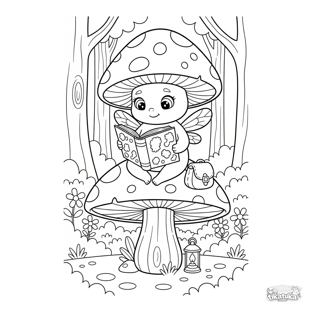 Página para colorear para niños 4-6: un duende de champiñón lee un libro de musgo brillante en un bosque encantado. Escena de fantasía adorable.