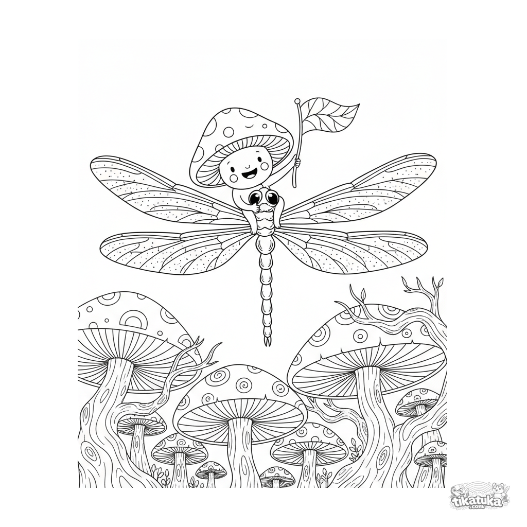 Página para colorear para 7-9 años: un duende champiñón monta una libélula gigante sobre un bosque encantado. Escena de fantasía con criatura amigable.