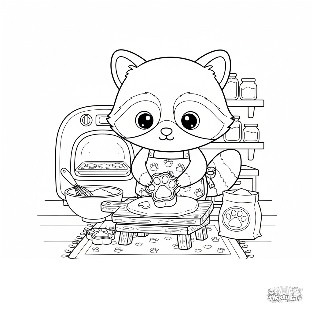 Página para colorear para niños de 4-6 años: un lindo mapache con delantal hornea galletas con forma de huella en una mini cocina acogedora. Muchos detalles lindos para colorear.