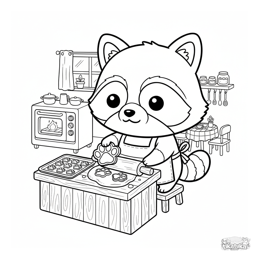 Página para colorear para niños de 4-6 años: un mapache adorable con delantal hornea galletas con forma de huella en una mini cocina acogedora.